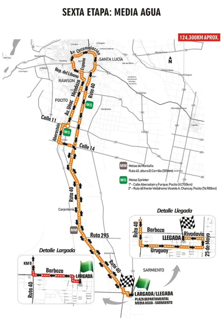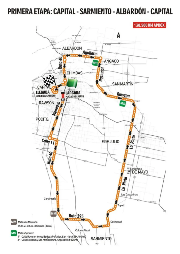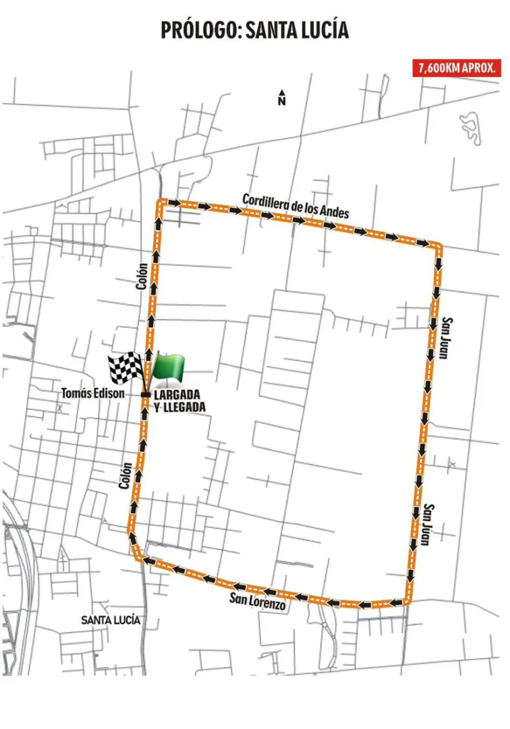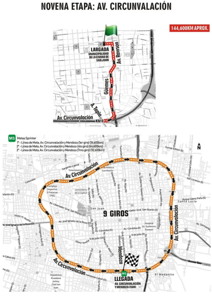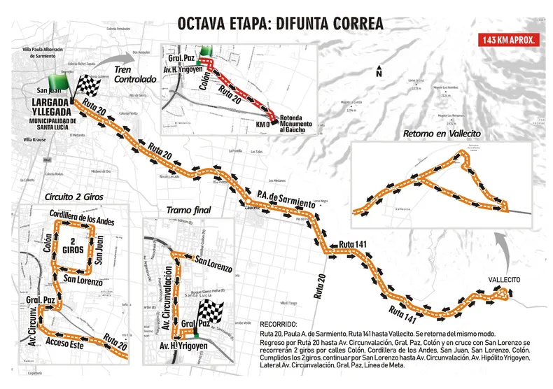 Recorrido: Por Ruta 20 hacia el este pasando por Las Chacritas (9 de Julio), puente río San Juan, ingreso al departamento Caucete, continuar por Ruta 20 hasta rotonda e ingreso a Diagonal Sarmiento, hasta rotonda y girar al este por Av. De los Ríos hasta empalmar nuevamente Ruta 20, hasta Ruta 141, al este en dirección a Vallecito, donde se girará en sentido inverso al reloj y retornar del mismo modo por Ruta 141, Ruta 20, Av. De los Ríos, Diagonal Sarmiento, Ruta 20, hasta Av. Circunvalación (Santa Lucía), al norte hasta calle Gral. Paz, al este pasando por Línea de Meta hasta calle Colón. Al norte hasta cruce con calle San Lorenzo. Desde este punto se recorrerán dos giros al circuito comprendido por calles Colón, Cordillera de los Andes, San Juan, San Lorenzo, hasta calle Colón. Cumplidos los dos giros continuar por calle San Lorenzo hacia el oeste hasta lateral oeste de Av. Circunvalación e ingresar al anillo hasta salir en Av. Hipólito Yrigoyen. Al este hasta lateral de Av. Circunvalación, calle Gral. Paz, hasta Línea de Meta, frente a Plaza de Santa Lucía.