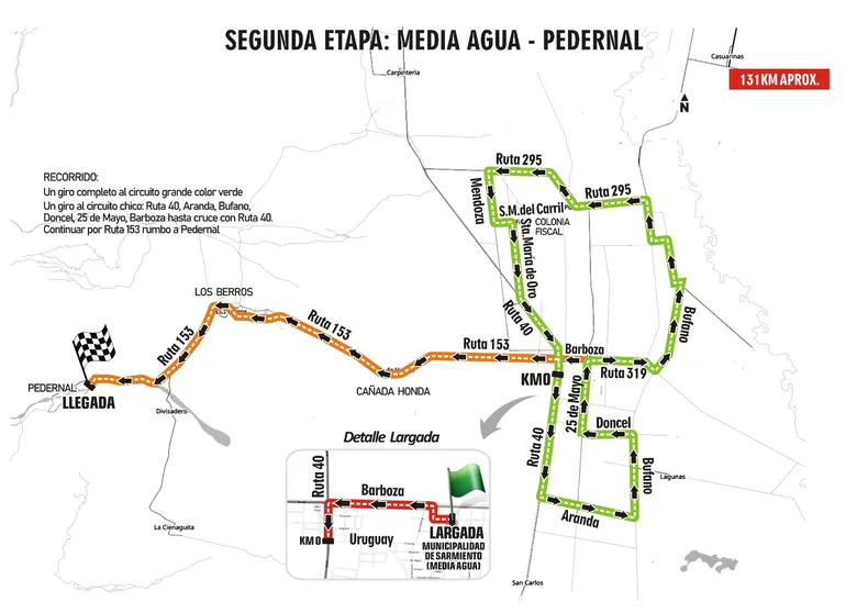 Recorrido: Por Ruta 40 hacia el norte hasta Calle 14 (Pocito), al oeste hasta calle Aberastain, al norte hasta Calle 11, al este hasta rotonda Av. Joaquín Uñac, al norte hasta empalmar calle Mendoza (Rawson), hasta calle República del Líbano, al oeste hasta Av. España, al norte hasta Av. Circunvalación, girar al oeste e ingresar al anillo hasta salir en Acceso Sur Ruta 40, al sur hasta Av. Uruguay (Media Agua), al este hasta calle 25 de Mayo, al norte hasta calle Rivadavia, al oeste hasta Línea de Meta frente a Municipalidad de Sarmiento.