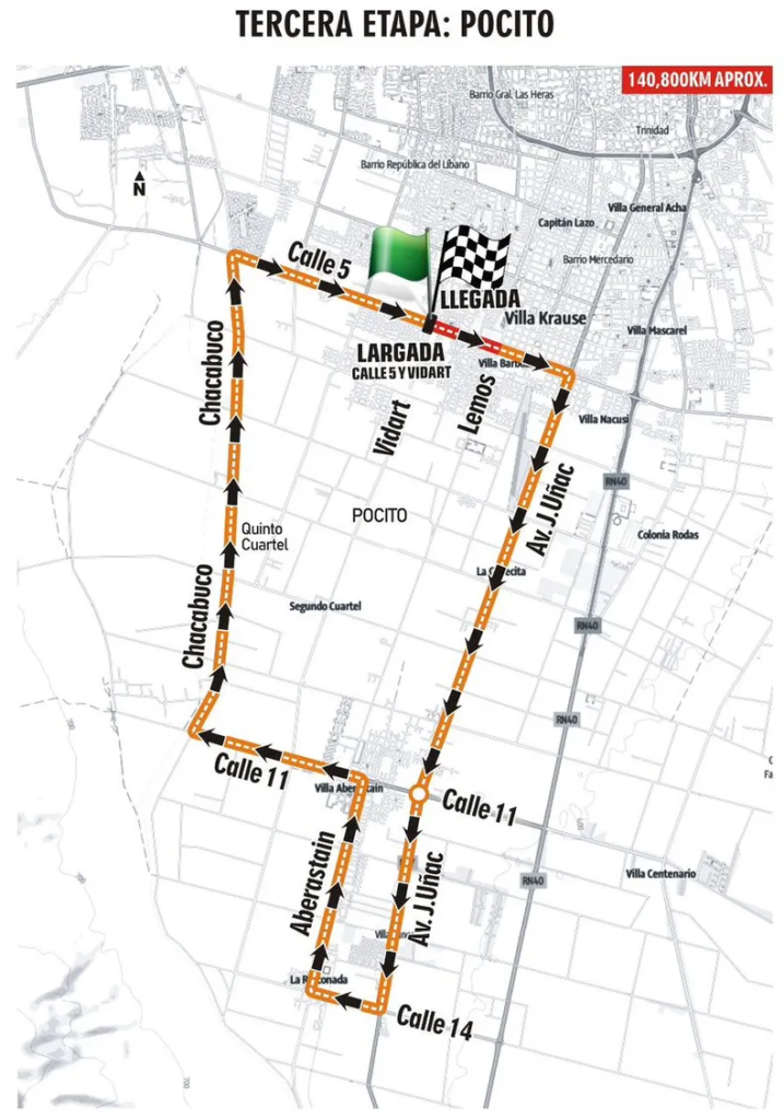 Recorrido: Por Calle 5 al este hasta calle Mendoza, al sur por Av. Joaquín Uñac hasta Calle 14, al oeste hasta calle Aberastain, al norte hasta Calle 11, al oeste hasta calle Chacabuco, al norte hasta Calle 5, al este hasta Línea de Meta en cruce con calle Vidart. Este circuito se recorrerá en cuatro oportunidades.