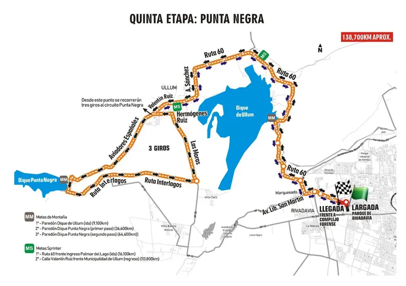 Recorrido: Por Av. Libertador Gral. San Martín al oeste hasta calle Galíndez, al norte hasta girar en la rotonda al oeste por Ruta 60, paredón Dique de Ullum, hasta calle Arnobio Sánchez, Valentín Ruiz, hasta cruce con calle Hermógenes Ruiz. Desde este punto se recorrerán tres giros al circuito comprendido por calles Aviadores Españoles, paredón Dique Punta Negra, Ruta Interlagos, calle Las Moras, Hermógenes Ruiz hasta nuevamente calle Aviadores Españoles. Cumplidos los tres giros girar al oeste por calle Valentín Ruiz, Arnobio Sánchez, Ruta 60, paredón Dique de Ullum, hasta rotonda calle Galíndez, al sur hasta Av. Libertador Gral. San Martín, al este hasta Línea de Meta frente a Complejo Forense de Rivadavia.