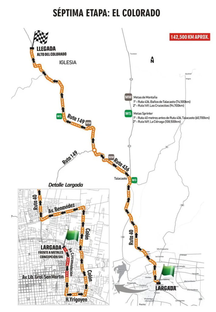 Recorrido: Por calle Colón hacia el norte hasta Av. Benavídez (Chimbas), al oeste hasta lateral Ruta 40, al norte subida a Ruta 40, pasando puente río San Juan, rotonda ingreso departamento Albardón, continuar por Ruta 40 hasta Ruta 436 (Talacasto), girar al oeste hasta Derivador y continuar por Ruta 149 hacia el norte hasta Línea de Meta en Alto del Colorado, Iglesia.